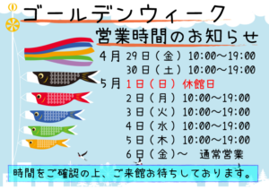 また、ゴールデンウィークの4月29日(金)から5月5日(木)までは祝日営業となります。